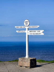 Il protagonista della scena è il cartello che segnala la località di Land’s End e che indica la distanza da John O’Groats in Scozia. Poco più spostata verso nord si trova The First and Last House, in cui ha trovato posto un altro localino per turisti.